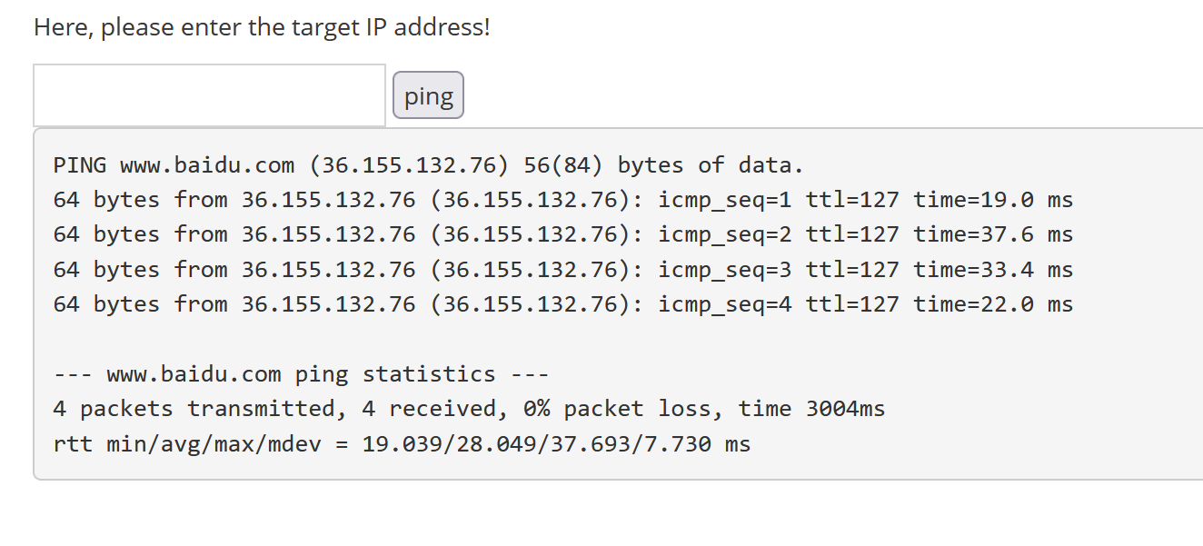 这里的分号是 Linux Shell 中的元字符,用于执行多条命令,几十前面的代码错了也可以执行。所以我们只需要输入 www.baidu.com ; ls