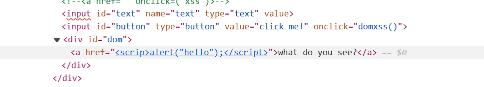 可以看到有一个 id 为 dom 的 div 框,里面将输入框里的文字放到了 href 里,就成了超链接。