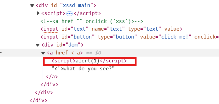 之类的,我们再看看代码发现有一个 onclick=”domxss()”