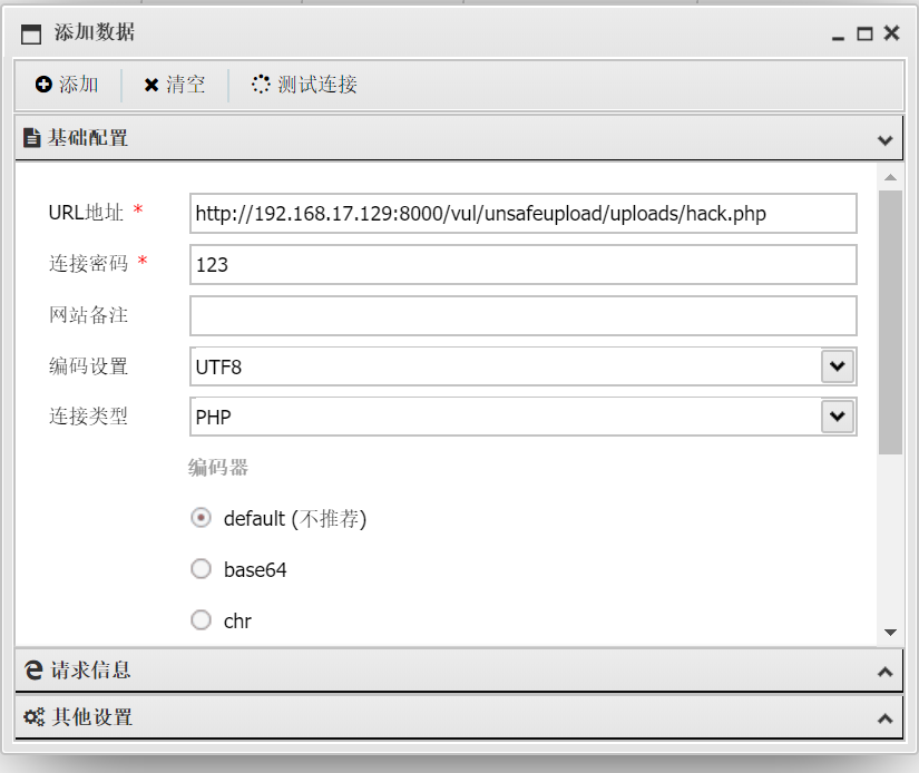 我可以放到蚁剑去检验,发现没用,因为它被后端框架被识别是图片,只会展示出来,我们需要用上之前节的文件包含,才会被识别为 php 代码。因为 Include 即使有报错也会往下运行,所以非常欧克。