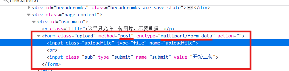 他说这里只允许上传图片,我们就看看这里的 HTML 语句,发现有一个 JS 代码限制了文件的类型。我们可以常识一下禁止 JS 代码或者修改 JS 代码。