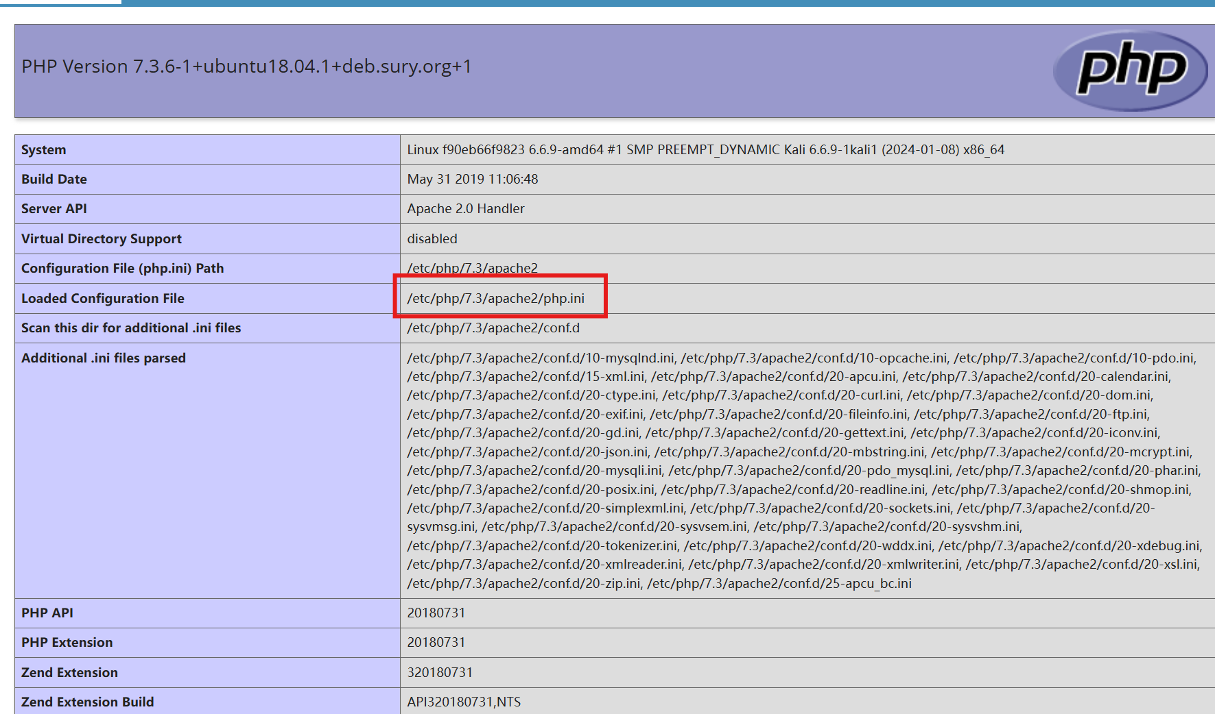 查看 php.ini 位置,我们到 RCE 那章的 exec “eval”那节输入 phpinfo();