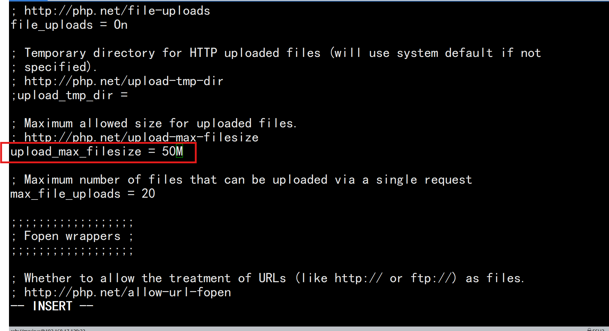 我们通过 cd 找到文件,然后输入 vim php.ini,按下 i 编辑,去编辑,随便修改一下大小,最后按下 esc,再输入:wq,OK!